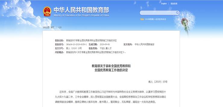 2019年9月4日“教育部关于表彰全国优秀教师和全国优秀教育工作者的决定”【教人〔2019〕15号】的名单中我院宁贵霞教授获得“全国优秀教师”称号。