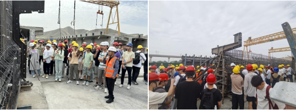 学生们在制梁场党委书记王领的带领下,参观了智能化钢筋剪切机、弯箍机、点焊机、全自动预应力钢绞线张拉机、桥梁架设运架一体机等先进机械设备,学习了如何通过RBMS梁场智慧管理平台实现制梁全过程智慧化管理,全面深入的讲解了32米和24米预制T梁施工全过程。