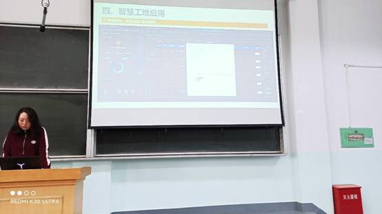 陈梦瑶高工以《智慧工地与BIM技术交流分享》为题,介绍了智慧工地的组成和发展,以甘肃六建智慧工地的应用为案例全面介绍了智慧工地建设要素、BIM应用、安全管理、质量管理和进度管理等内容,丰富了同学们的视野。