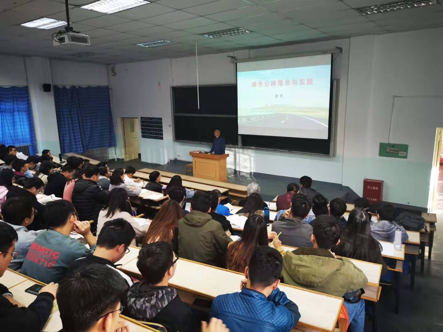曹贵总工程师结合自己对“绿色公路”的学习和认识、多年的一线经验及项目真实案例,从“绿色公路”的定义内涵、建设思路及要求、采取的主要措施、设计及施工五个方面为师生讲授了一堂理论结合实践的讲座,并进行了互动交流。讲座结束后,同学们纷纷表示,讲座案例丰富、内容精彩,拓展了他们的社会视野,激励他们珍惜时光、奋发向上,启迪了同学们对绿色公路、和谐未来的思考。