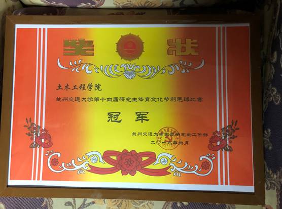 经过充分的赛前准备、刻苦的团队训练以及赛场上的奋力拼搏,我院最终荣获兰州交通大学第十四届研究生体育文化节团体总分第三名。其中,羽毛球比赛喜获冠军,“火车”赛跑获亚军,拔河比赛获季军,乒乓球赛进入八强。