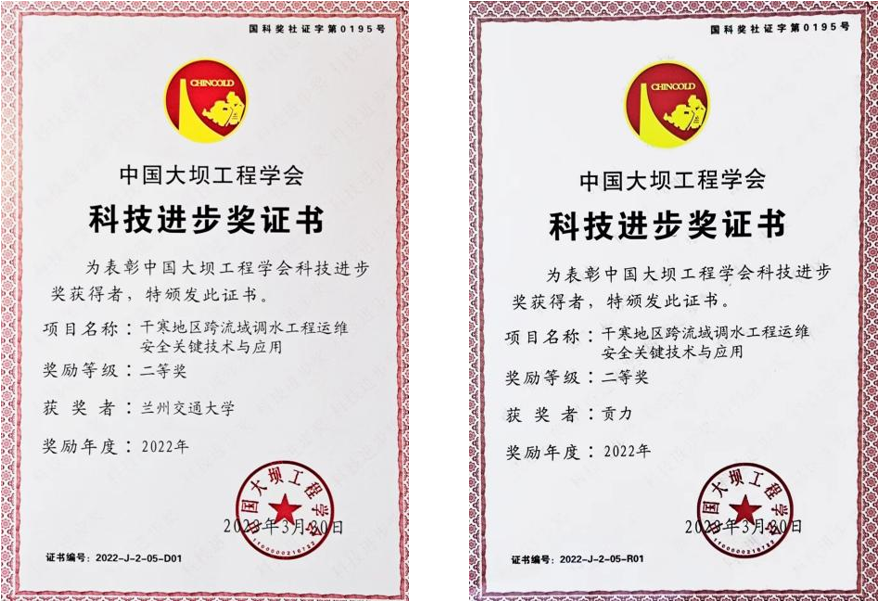 我校贡力教授申报的“干寒地区跨流域调水工程运维安全关键技术与应用”获得2022年中国大坝工程学会科技进步二等奖。该科研成果由我校联合中水北方勘察设计研究有限责任公司及国网甘肃省电力公司电力科学研究院等单位完成。