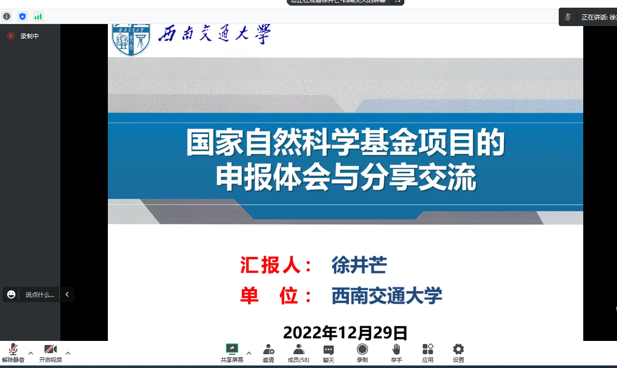 2022年12月29日下午,土木工程学院邀请西南交通大学教授、博士生导师,国家优秀青年基金获得者徐井芒教授作了题为“国家自然科学基金项目的申报体会与分享交流”的线上学术报告。土木工程学院相关老师、研究生等80余人参加,学院分管领导主持报告会。
