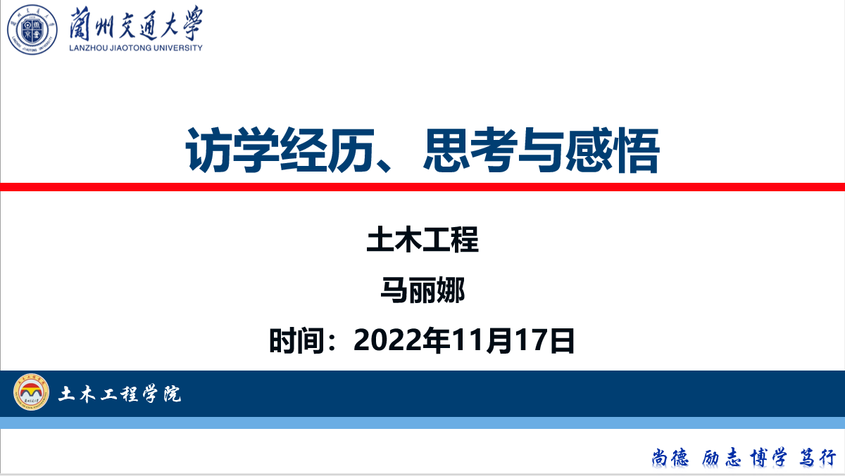 2022年11月17日下午,土木工程学院教师马丽娜副教授作了题为“访学经历、思考与感悟”线上学术报告。土木工程学院相关教师、研究生和校外部分单位的专家学者约120多人参加,学院分管领导主持报告会。