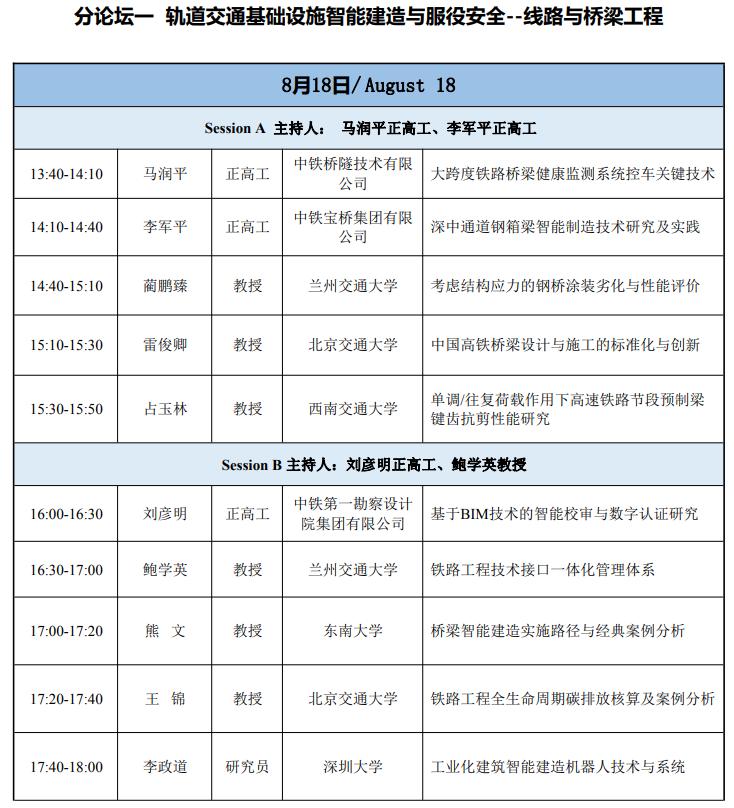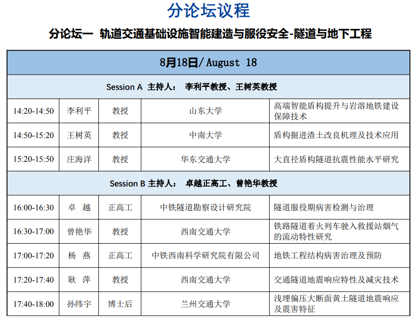 2022年8月18-19日,由我校主办,西南交通大学、北京交通大学等13家轨道交通领域高校、科研院所和企业联合协办的第二届“一带一路”轨道交通发展论坛在线上召开。我院负责承办“轨道交通基础设施智能建造与服役安全”分论坛,包含“线路与桥梁工程”和“隧道与地下工程”两个分会场,邀请包括同济大学、中南大学、山东大学、东南大学、西南交通大学、北京交通大学、华东交通大学、兰州交通大学、石家庄铁道大学、上海交通大学、深圳大学、中国铁道科学研究院、中铁一院、中铁西南院、中铁隧道、桥隧和宝桥集团、中交公路长大桥梁建设国家工程研究中心等科研院所、设计、建设等等不同单位的34位知名专家学者和优秀青年学者,围绕轨道交通基础设施的智能建造与服役安全主题,分享了最新研究成果,共计吸引了国内外超千名行业专家学者和硕博士研究生参与线上交流。