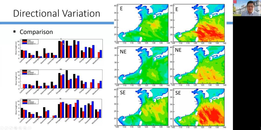 潘顺琪教授分享了自己在国外的求学和工作经历,讲述了自己的职业发展之路,勉励同学们掌握科学技术,做好人生规划。他介绍了英国卡迪夫大学及其所在的工程学院的情况,介绍了其利用欧洲中期预报中心风场、台风模型以及FVCOM-SWAVE对西北太平洋台风引起的极端波浪和增水研究过程,以英国东部海岸和中国黄河口为例,结合风暴潮、海岸侵蚀、泥沙输运等,向参会师生们讲授了遥感技术和数值模拟的重要作用。