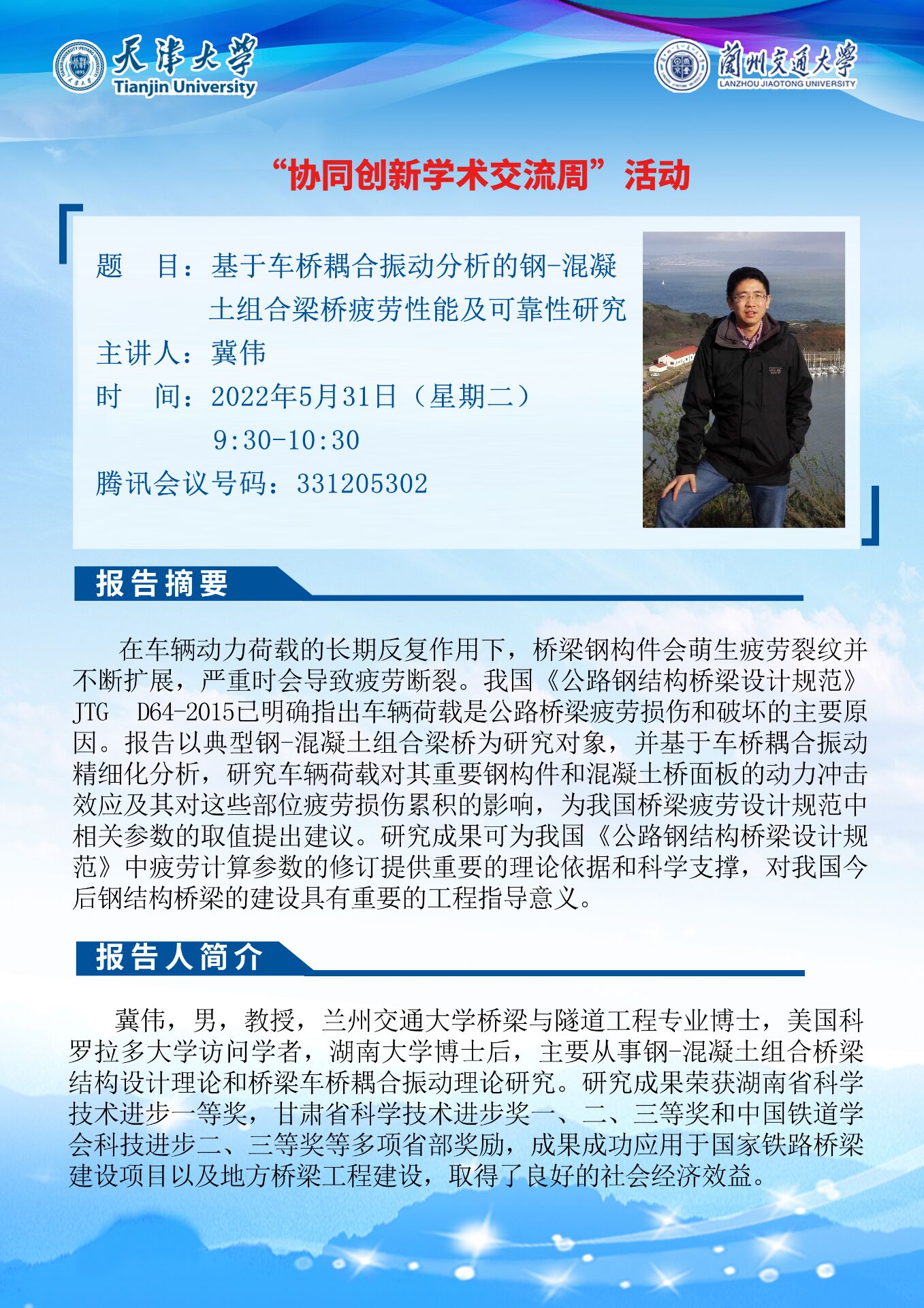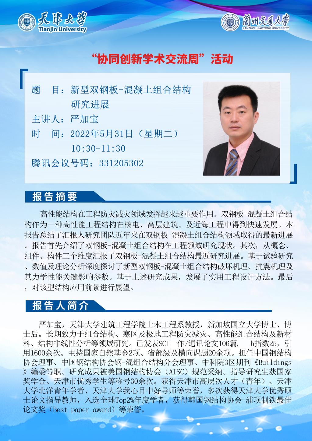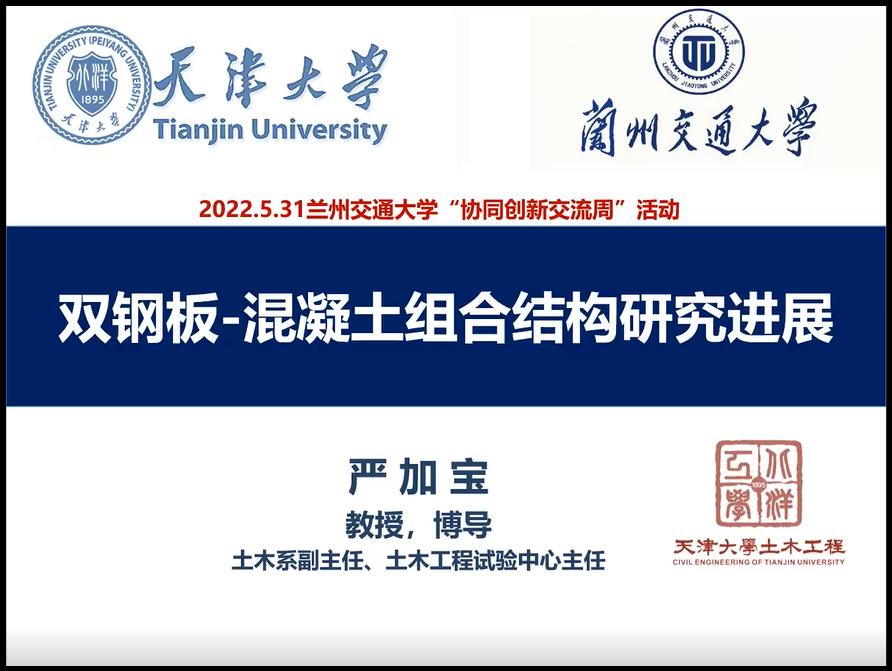 5月31日,土木工程学院邀请天津大学马超教授和严加宝教授我院冀伟教授为学院师生分别做了《“双碳”目标驱动下的清洁能源系统开发及电能替代效应研究》《新型双钢板-混凝土组合结构研究进展》和《基于车桥耦合振动分析的钢-混凝土组合梁桥疲劳性能及可靠性研究》的学术报告报告会为天津大学-兰州交通大学“协同创新学术交流周”活动之一。