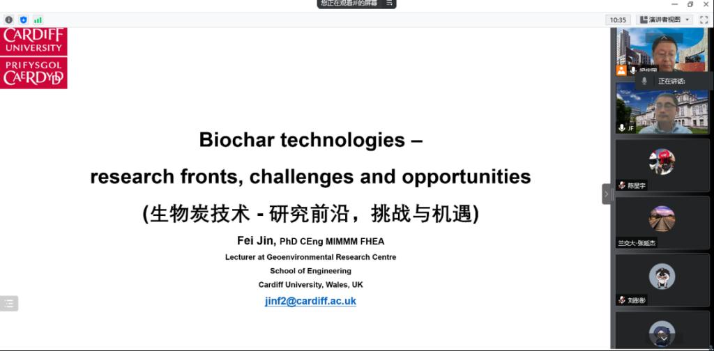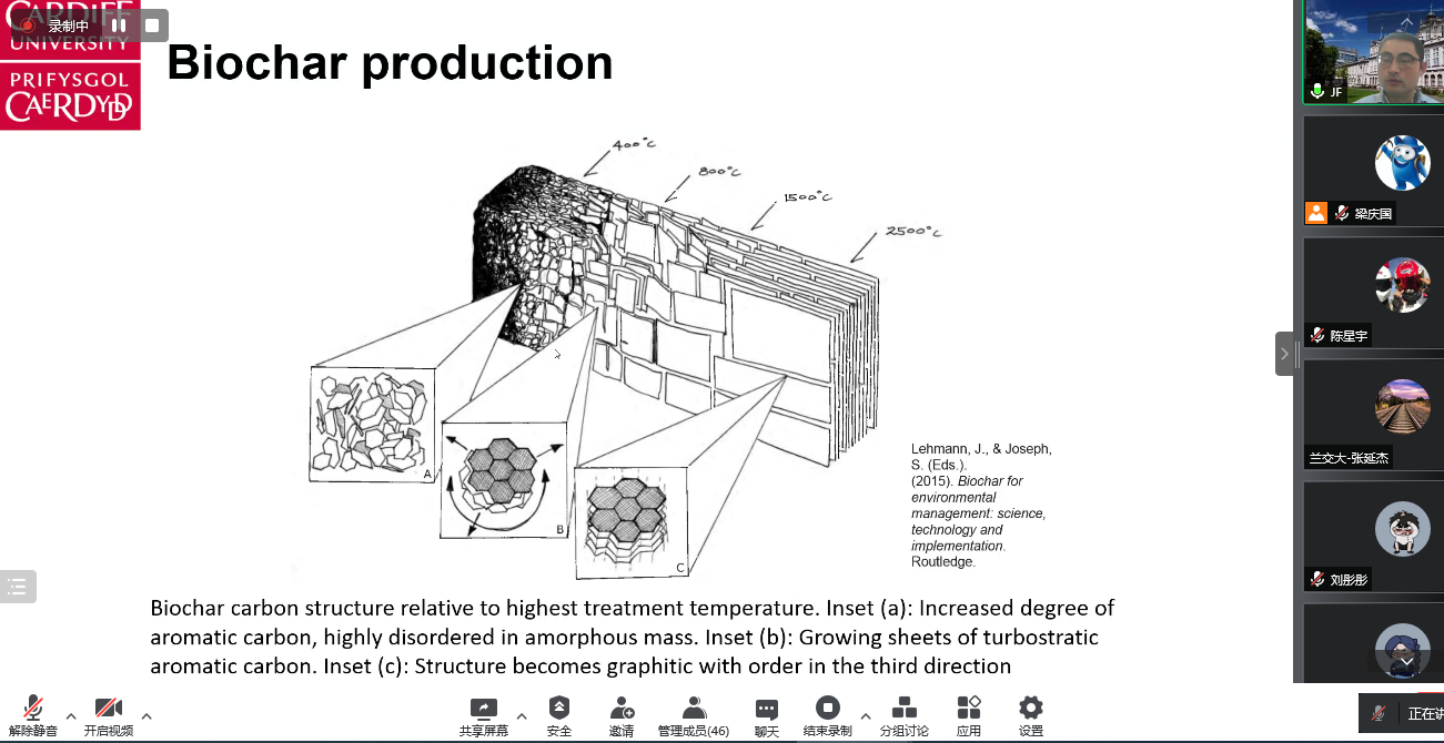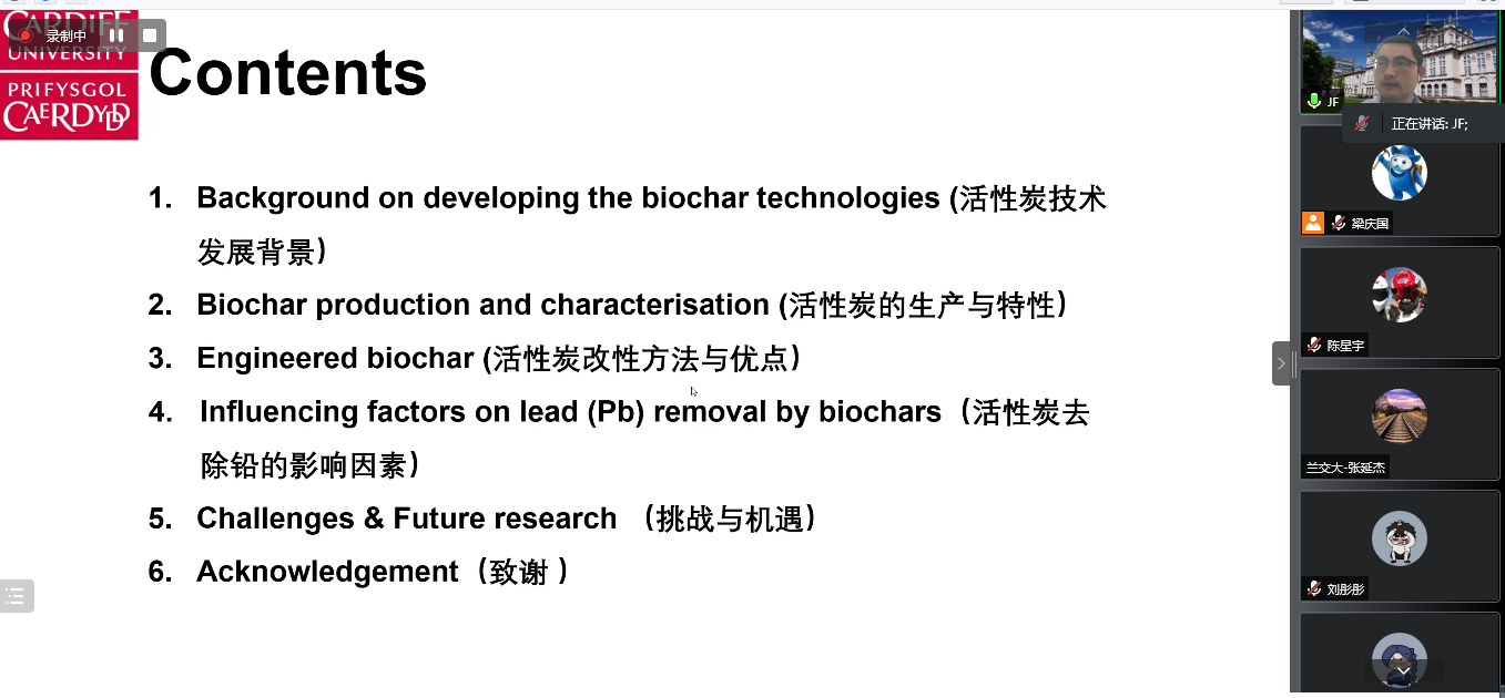 金飞博士首先简要介绍了卡迪夫大学在该领域的研究团队、主要方向与实验室等情况,然后分别从生物炭技术的研究前沿、挑战与机遇,活性炭技术的发展背景、活性炭的生成与特性、活性炭的改性方法与优点、活性炭去除铅的影响因素等方面,系统介绍了国内外最新的研究进展,最后针对活性炭技术,指出了目前科学研究和工程应用中主要存在的挑战与机遇。主旨报告结束后,金飞博士与参会师生进行了热烈的交流互动,针对黄土地区碳捕集与封存、生物碳制备技术、混凝土材料中的生物炭应用等问题进行了详细的解答与交流。