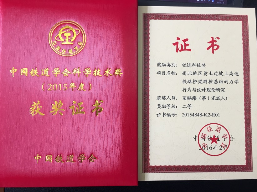 近日中国铁道学会公布了2015年度中国铁道学会科学技术奖项目(学秘[2016]3),由我院蔺鹏臻教授团队完成的《西北地区黄土边坡上高速铁路桥梁群桩基础的力学行为与设计理论研究》获得铁道科技二等奖,张戎令副教授团队完成的《兰新高铁戈壁、大温差、大风环境下耐久性混凝土配制技术及应用》获得铁道科技三等奖。
