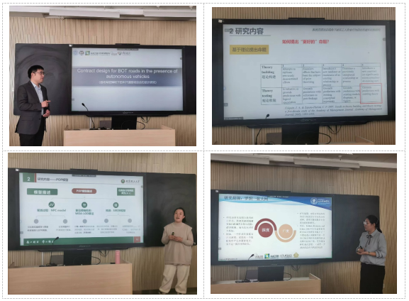 大连理工大学冯卓副教授以“自动驾驶情境下BOT道路项目合同设计研究”为题做学术分享,重点强调了更广义范围的解释是充分体现研究结果价值的关键所在。东南大学夏妮妮副教授以“基于青年基金的研究设计分享与思考”为题做学术分享,指出选题出发点需要由渐进式洞见向启示性洞见转变,创新思路需要由繁殖式创新向竞争性创新转变。北京理工大学丁洳茜副研究员以“Public Opinion Prediction with Detecting of Leaders' Opinionson Social Media by Using Machine Learning Methods”为题做学术分享,重点说明了对基础理论及方法的创新,是有效支持选题设计及延拓的重要支撑。北京交通大学郭文倩老师以“研究选题: 如何兼顾新颖性与可操作性”为题做学术分享,提示了选题容易出现的“陷阱”,阐述了问题深度与广度之间的协调性,并强调了选题的可操作性更多来自于对实践的洞察力。