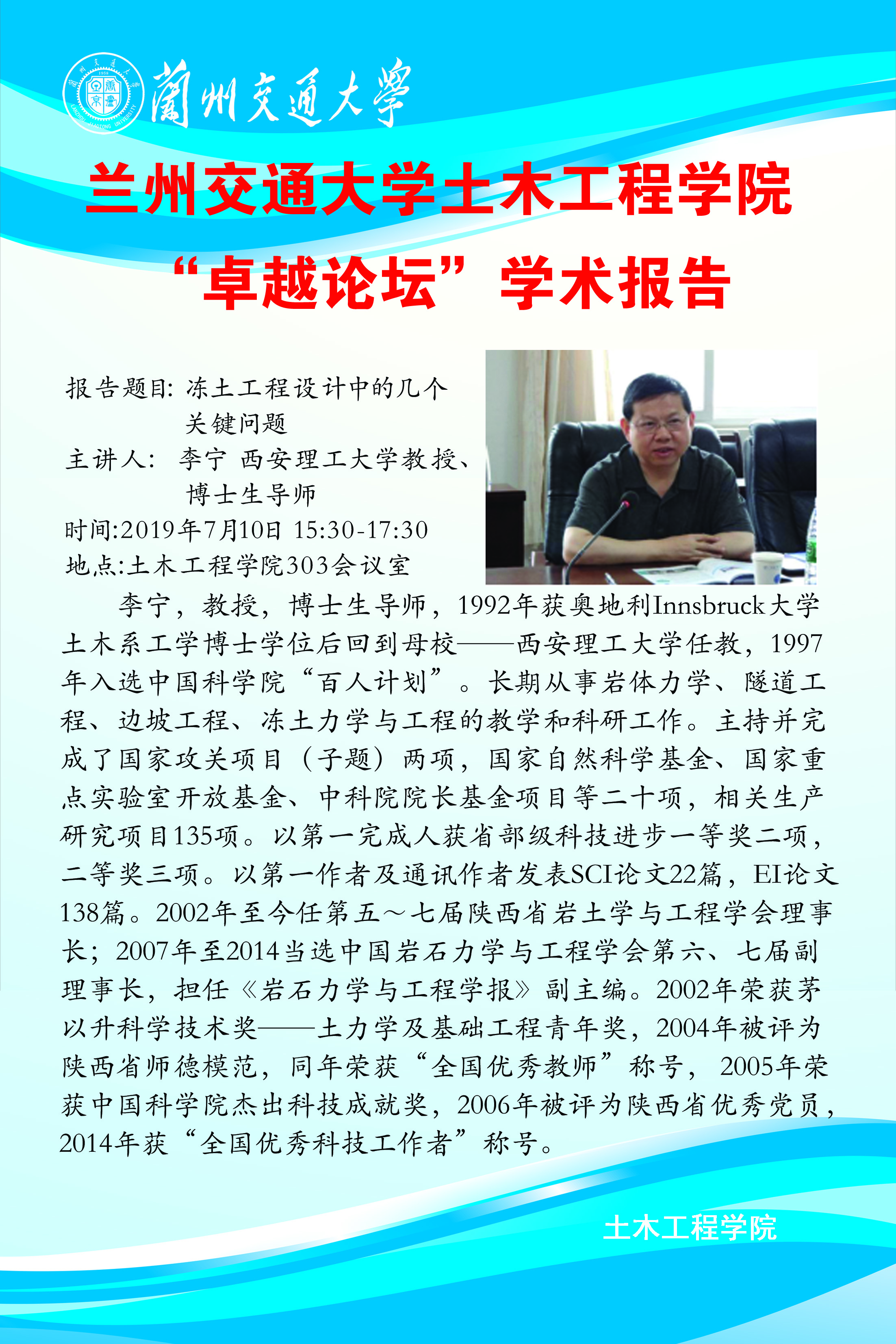 李宁,教授,博士生导师,1992年获奥地利Innsbruck大学土木系工学博士学位后回到母校——西安理工大学任教,1997年入选中国科学院“百人计划”。长期从事岩体力学、隧道工程、边坡工程、冻土力学与工程的教学和科研工作。主持并完成了国家攻关项目(子题)两项,国家自然科学基金、国家重点实验室开放基金、中科院院长基金项目等二十项,相关生产研究项目135项。以第一完成人获省部级科技进步一等奖二项,二等奖三项。以第一作者及通讯作者发表SCI论文22篇,EI论文138篇。2002年至今任第五~七届陕西省岩土学与工程学会理事长;2007年至2014当选中国岩石力学与工程学会第六、七届副理事长,担任《岩石力学与工程学报》副主编。2002年荣获茅以升科学技术奖——土力学及基础工程青年奖,2004年被评为陕西省师德模范,同年荣获“全国优秀教师”称号, 2005年荣获中国科学院杰出科技成就奖,2006年被评为陕西省优秀党员,2014年获“全国优秀科技工作者”称号。