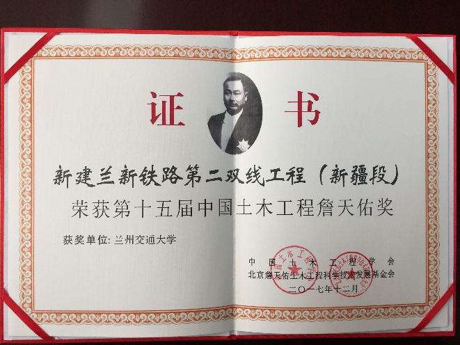 我校张戎令副教授参与的《新建兰新铁路第二双线(新疆段)》获第十五届中国土木工程詹天佑奖。本届仅有两所高校获得该奖项:兰州交通大学、浙江大学(新建杭州东站扩建工程站房及相关工程)。这是我校首次在土木工程领域获得该奖项,也是兰新铁路第二双线项获奖单位(业主、设计、施工和科研院所等)中唯一一所高校。
