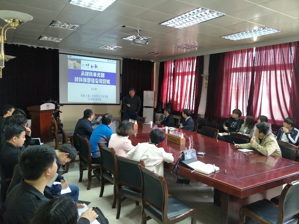 2018年4月1日上午9时,西南交通大学力学与工程学院蔡力勋教授应土木工程学院邀请来我院进行学术交流,开展了题为《一叶知秋——从材料单元到材料弹塑性毫微测试》的学术报告。报告由虞庐松院长主持,工程力学系吴亚平教授、工程力学系主任赵宪锋副教授等学院众多师生参加并认真聆听了报告。