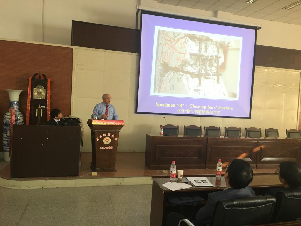 报告分为两个环节。第一环节Riyad S. Aboutaha教授介绍了近年来在钢筋混凝土结构中所做的一些创新实验与探究及钢管混凝土的实验分析,从承载力及延性方面解释了结构在发挥抗震性能方面的优势,Riyad S. Aboutaha教授热情洋溢,对所做的工作做了全方位的解释。第二环节为答疑,对老师同学的提问,Riyad S. Aboutaha教授逐一做了回答,并结合已完成的工作深入谈了自己的观点。