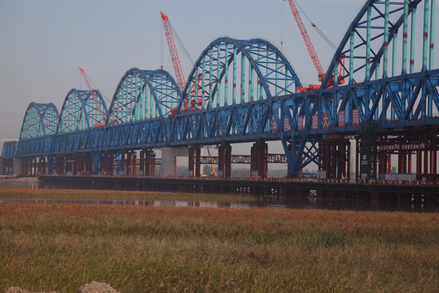 银川机场黄河特大桥全长13.814公里,银西高铁银吴段的重点工程之一,其中主桥长1200m,为两联简支钢桁梁和两联3×168m连续钢桁梁柔性拱结构,下部为大直径超长灌注桩基础,墩柱承台均为大体积混凝土结构,总用钢量24774.3吨,是西北地区规模最大的钢结构桥梁之一。该桥在国内首创“跨中搭设支架、双悬臂对称、拱梁同步”的架设施工工艺,实现了主桥钢梁架设与主桥下部基础同步施工、主桁架设与柔性拱架设同步施工、连续梁架设与简支梁架设同步的“三同步”施工,使主桥成桥日期提前了近半年,全桥总工期由45个月优化到14个月。