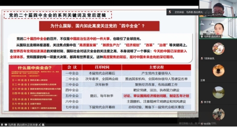 报告会上,马乔恩教授以“全会意义-目标原则-战略要点”为脉络,展开系统深入的解读。她首先指出,党的二十届四中全会是在全面建设社会主义现代化国家新征程关键节点召开的一次具有里程碑意义的重要会议,不仅系统梳理了新时代以来党和国家事业取得的重大成就、积累的宝贵经验,更围绕中国式现代化作出一系列战略性部署,为全党统一思想、凝聚共识、奋进实干提供了根本遵循。马教授结合党史发展脉络与当代发展实践,深刻阐释了全会对于巩固党的执政根基、完善中国特色社会主义制度、推进国家治理体系和治理能力现代化的深远历史意义和现实指导价值。