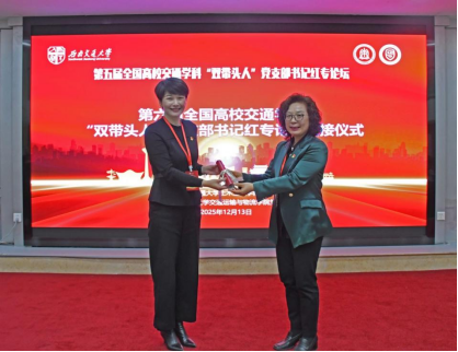 闭幕仪式上,举行第六届全国高校交通学科双带头人党支部书记红专论坛承办权交接仪式我校土木工程学院党委书记王娜从西南交通大学土木工程学院党委书记郑江手中郑重接过接力棒代表下一届论坛主办方作表态发言。