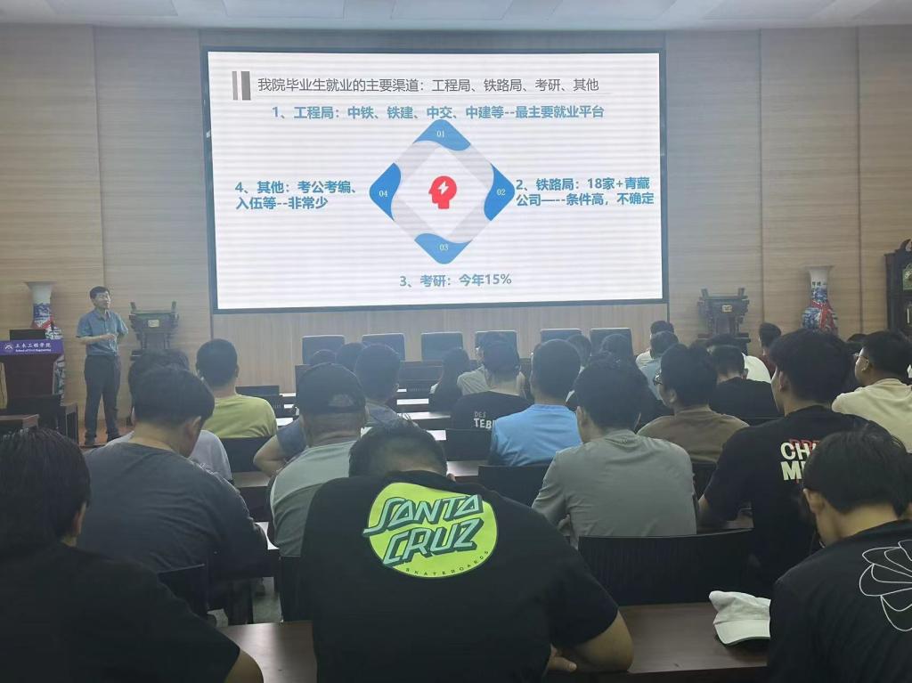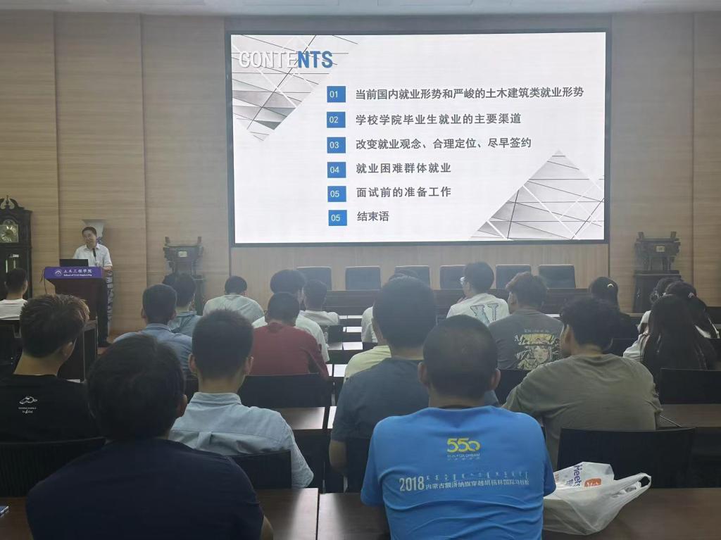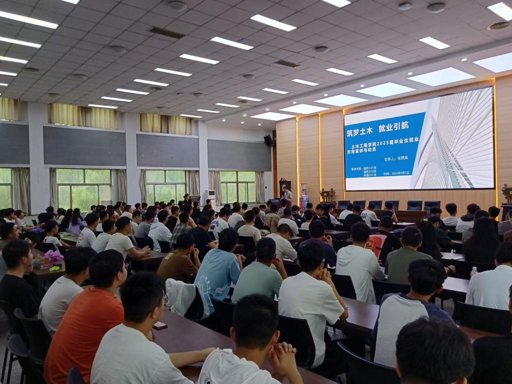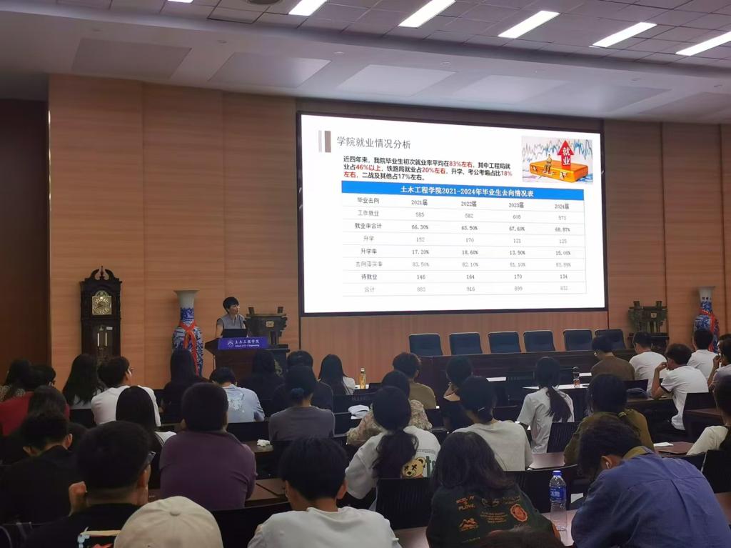 学院领导班子首先向2025届毕业生分析了当前国内就业形势和土木建筑类就业形势,通报了学院近年来各专业毕业生去向落实情况,以及毕业生就业的主要渠道和相关就业数据。通过校友的真实案例示范举例,学院要求毕业生们要改变就业观念、合理定位、积极签约,重点做到以下四点。一是要走好人生的第一步,主动适应当前严峻就业形势,客观看待行业和社会发展的周期变化规律,适当转变就业观念,调整就业心态,不等不靠,主动出击积极求职;二是要根据个人实际情况,要做好生涯成长规划,提前谋划,做好就业精准定位,在就业和考研以及具体就业去向上对自己做合理客观评估;三是要抓住金九银十的就业黄金期,不盲目跟风,先就业,后择业,逐步实现高质量就业;四是提升个人求职竞争力,紧跟政策导向,以实现专业技术转化和自我价值实现为初衷,深入专业主战场建功立业。