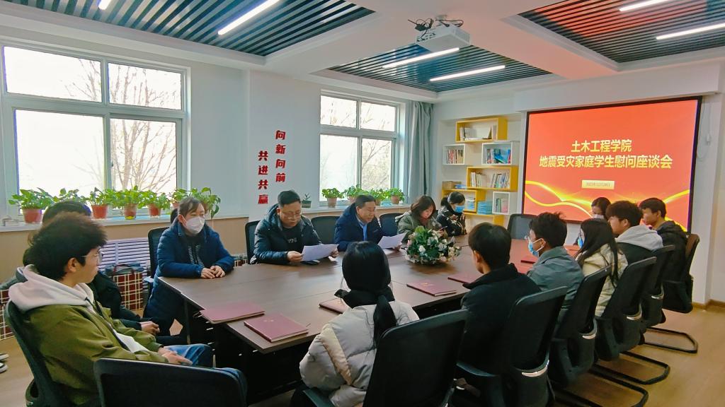 牵挂学生急难愁盼,关心学生安危冷暖。发生地震后,学校学院密切关注灾情发展变化、心系相关地区学生的家庭受灾情况,为切实做好受灾学生的救助帮扶工作,保障学生正常学习生活。12月28日,土木工程学院开展地震受灾家庭学生慰问座谈会,学院党委副书记、副院长林梦凯、学生工作办公室主任胡渊、辅导员戴一帆、刘艳、何汉霞及受灾家庭学生参加会议。