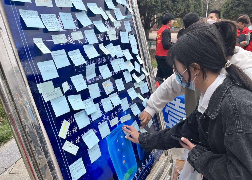 此外,我院志愿者在逸夫图书馆们前悬挂关爱孤独症儿童主题宣传横幅,组织我校学子进行签名,同时为他们讲解关于孤独症儿童的相关知识,邀请他们一起为孤独症儿童书写祝福语,一起放飞纸飞机,同时号召广大青年学子积极参与到关爱孤独症儿童相关活动中去,让特殊群体感受到更多的温暖和社会力量的支持,也希望通过活动凝聚爱的力量,倡导更多爱心人士关注、接纳和包容特殊人群,帮助自闭症等特殊孩子树立生活信心,在社会大家庭的关心和关爱下,积极面对每一天。
