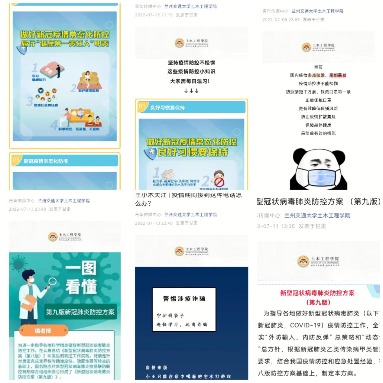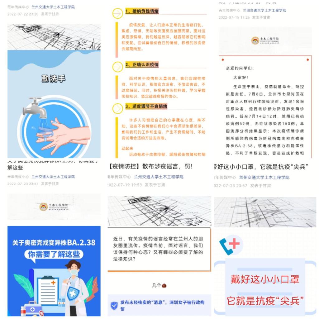 深化网络矩阵育人,建好战疫防火墙。构建全方位、全覆盖、全天候宣传矩阵,大力宣传疫情防控工作部署和防控知识,着力讲好师生抗击疫情的感人故事。学院积极利用网络平台开展工作,发布《致广大在校同学的一封信》《致广大离校同学的一封信》《@各位土小木,这些疫情防控小知识,要每日温习哟!》《土小木关注|疫情期间接到这种电话怎么办?》《一图读懂第九版新冠肺炎防控方案》《散布涉疫谣言,罚!》《疫情期间,学会正确洗手,保持手部卫生》《带好这小小口罩,它是抗疫“尖兵”》《关于奥密克戎异珠BA.2.38,你需要了解这些》等微信推文,进行疫情知识普及,凝聚抗疫正能量,筑起疫情防控墙,积极引导师生讲规矩、守纪律、重担当,不恐慌、不信谣、不传谣,在全院范围内营造健康向上的抗疫舆论氛围。