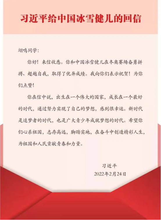 习总书记回信冰雪健儿,充分表达对冰雪健儿取得优异成绩的祝贺和赞扬。并强调了青年对于一个国家的重要意义——“新时代是追梦者的时代,是广大青少年成就梦想的时代”。