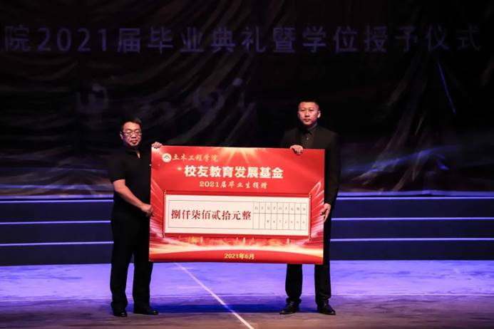 典礼举行了2021届毕业捐赠活动,学院党委书记周涛代表学院接收了毕业赠品。通过这一形式,蕴含毕业生心系土木的赤子情怀,表达了对学校的感恩之意。他们是新时代的逐梦者、奋进者、自强者,以优秀的政治品质、深厚的专业功底,卓越的创新能力,勇担使命,服务社会,创造未来。