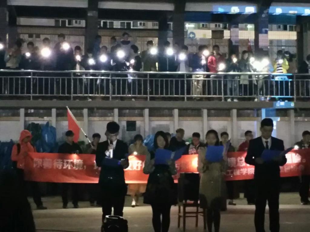 活动准备期,操场已经聚集了许多前来参与活动的同学。在20点30分,活动正式开始,首先由土木十佳歌手演唱了开场曲目,呼吁大家打开手机闪光灯,调动全场气氛。在闪光灯中,志愿者宣读了此次活动的主要目的,并且向大家宣讲了节约用电的益处。之后,由风云棍社带来了精彩的表演,全程气氛达到高潮,吸引了更多的同学前来观看活动。然后由工程管理1701班的同学们表演了“减排三句半”节目表演,通过这个节目,使得同学们深刻的了解到减排的重要性。在之后的节目中,志愿者们巧妙的加入了减排的小知识,让减排主题贯穿整个活动。活动接近尾声时,由志愿者代表带领同学们进行了减排宣誓,同学们热情高涨,纷纷表示在以后的生活中会将减排进行到底。最后,志愿者组织了参加此次活动的各个班级进行了跑旗,活动圆满成功。
