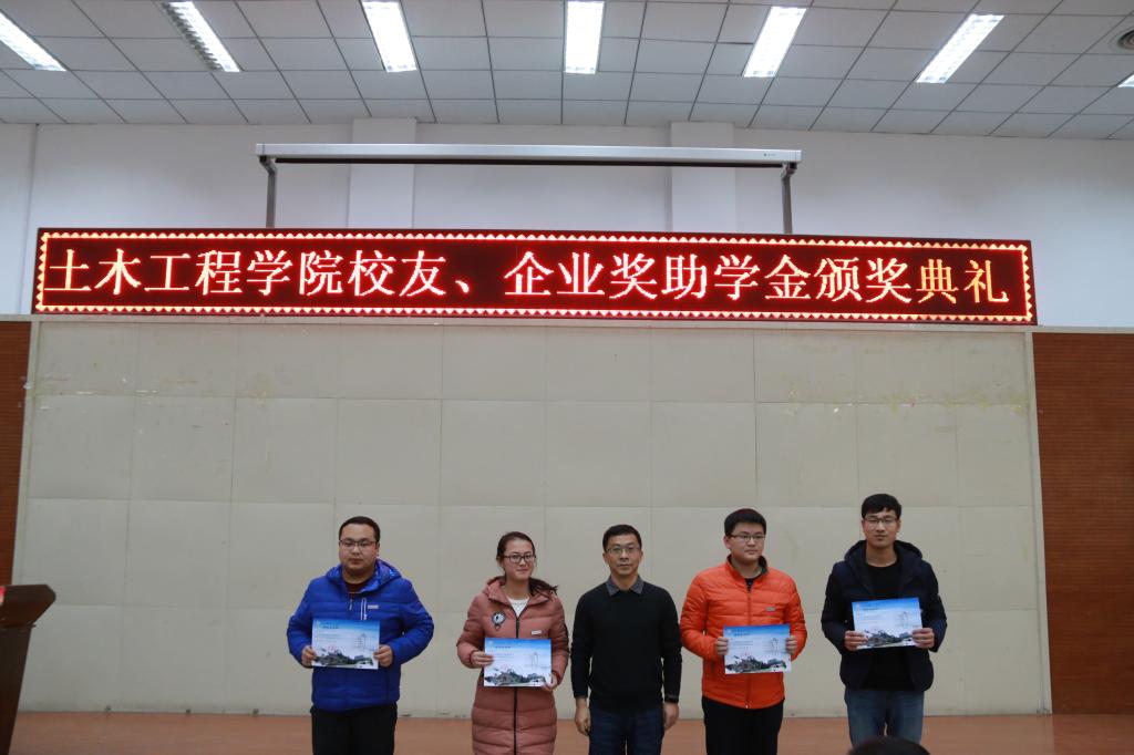 2017年12月28日下午3:30,在土木工程学院五楼多功能厅举行了企业和校友奖助学金颁奖典礼。苏交科集团甘肃交通规划设计有限公司人力资源部总经理王克俭、工78校友兰州交大咨询公司董事长刘凤奎、建93校友土木学院鲍学英、工93校友土木学院王保成、建97校友中铁二院西北分公司建筑处处长田义斌、建97校友土木学院杨华中、学校教育发展基金会秘书长、对外联络处处长王立华、学生处副处长王亚平、土木工程学院院长虞庐松、党委书记李爱春、副院长王恩茂和200余名学生参加了典礼。典礼由土木工程学院党委副书记、副院长周涛主持。