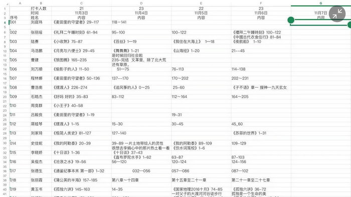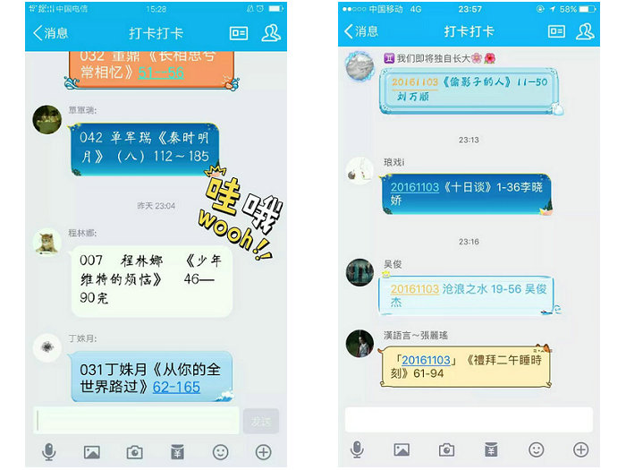 在读书漂流活动进行后的第三天开启了“读书打卡”配合读书漂流活动同时进行。通过QQ群,每位参与者在早晨定下一天的读书目标,一天结束后对读书情况进行总结,并分享对数心得。读书打卡有效的提高了同学们的阅读兴趣,使读书成为每天必做的一件事,截至目前打卡人数三十二人,平均每日打卡22人,阅读量达8000页,累计900000字。11月12日,读书漂流第一期圆满结束。