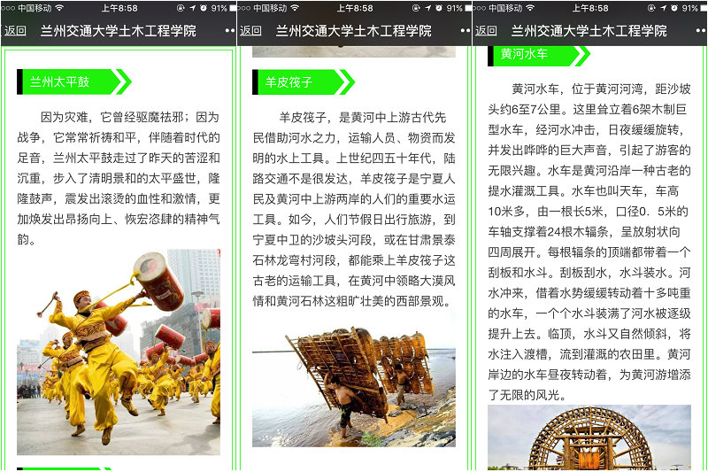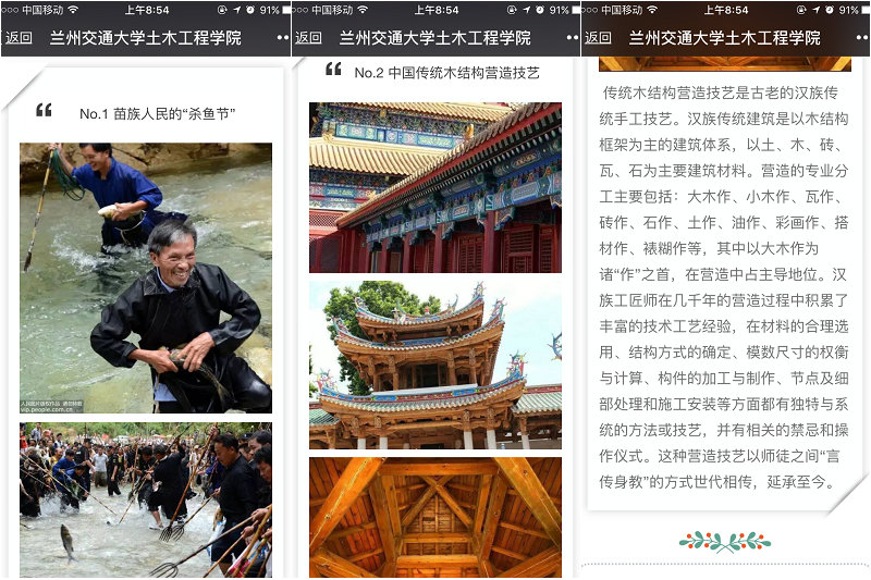 我院微信平台连续推出我国的“非物质文化遗产”专题推送。推送了“非物质文化遗产接力之——兰州站”,对兰州的非物质文化遗产如:“兰州太平鼓”、“羊皮筏子”、“黄河水车”等进行了相关介绍,就其起源等多各方面进行了详细描述。同时,我院也积极展开了微信线上线下互动,同学们纷纷通过留言的方式表达自己的感想。