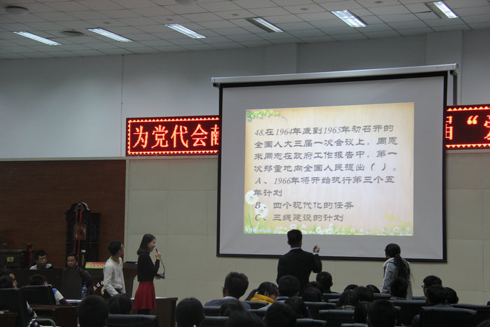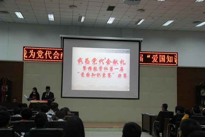 活动伊始,学院党委副书记、副院长周涛老师致辞。周老师表示,党代会是学校的大事也是喜事,是党的先进性和民主性的体现,作为学生党员,应积极关注学校党代会,能够当选学生党代表参与党代会是无上光荣的,学生党员积极参加党代会前的各项宣传活动也是非常有意义的;在党代会召开之前,为党代会献礼,举办“爱国知识竞赛”意义深远;格致学社是作为马克思主义理论学习型社团,在我们学校是一个很特别的社团,活动内容不同于其他社团丰富多彩的校园文化活动,然而,大学不应该只为文体娱乐、兴趣特长提供平台,更应该有思想的提高、精神的升华,希望更多的同学,尤其是学生党员能够积极的参与其中。