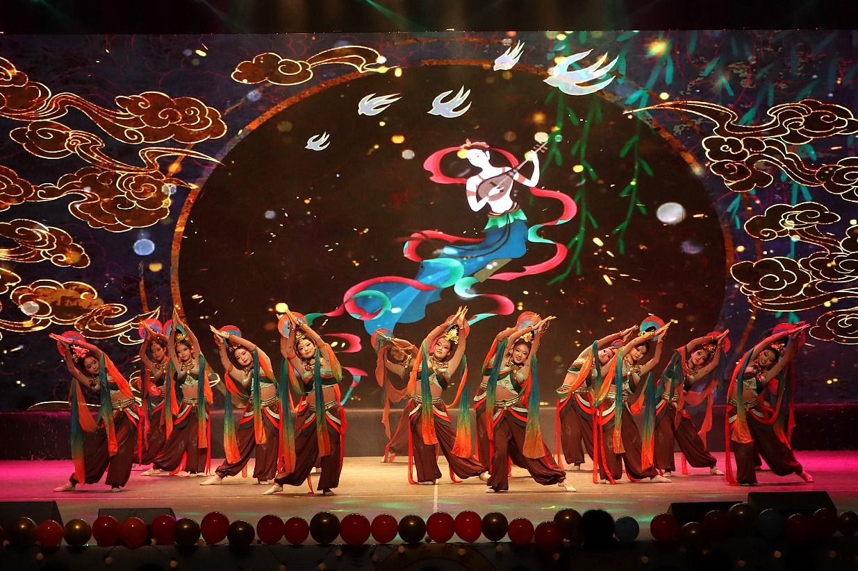 晚会在一曲《我爱你中国》中拉开序幕,嘹亮的歌声传递出对祖国的热爱,展现了青年学子的家国情怀,瞬间点燃了全场气氛。交大附中的舞蹈《敦煌梦》带领观众走进了神秘而绚丽的敦煌文化世界。舞者们身着精美的敦煌服饰,凭借灵动的舞姿和细腻的表情,将敦煌壁画中的飞天形象栩栩如生地呈现在舞台上,每一个动作都仿佛诉说着古老的故事,令观众陶醉其中。