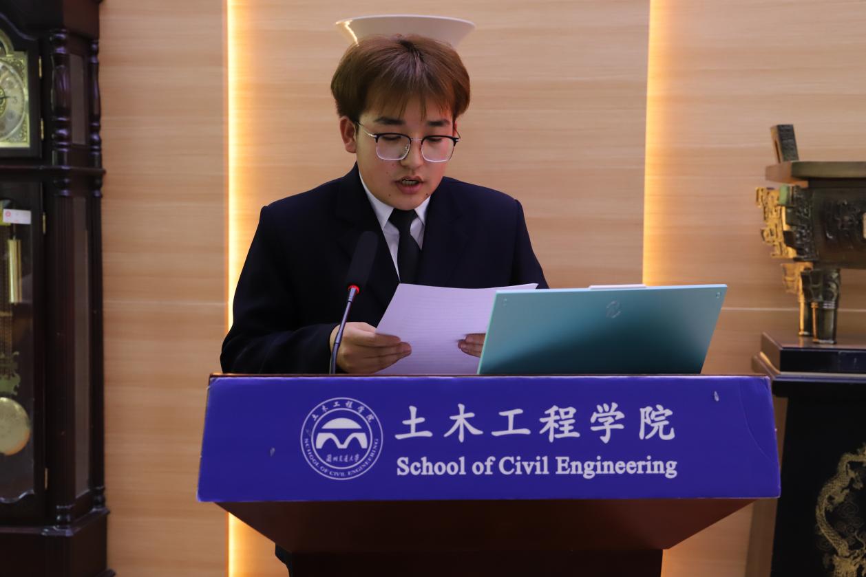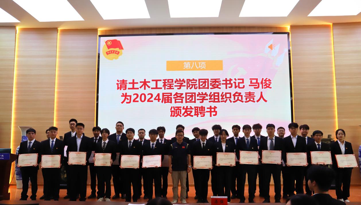 正式会议在庄严的国歌声中拉开帷幕。院团委书记马俊老师代表学院团委致贺信,号召全体学生会工作人员始终牢记“全心全意为同学服务”的根本宗旨,继承和发扬“逢山开路,遇水架桥”的土木精神,在思想引领、学风建设、校园文化等方面展现新作为。同时,为2024届全体团学组织主席团成员颁发聘书。