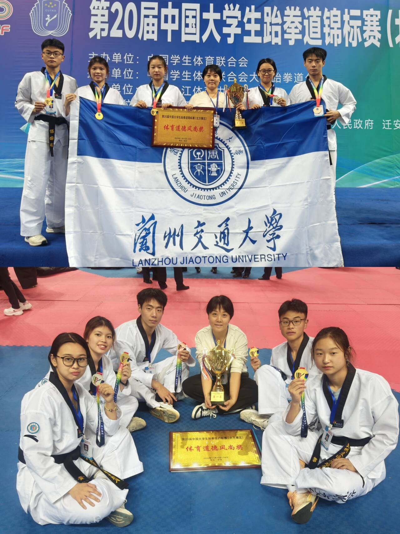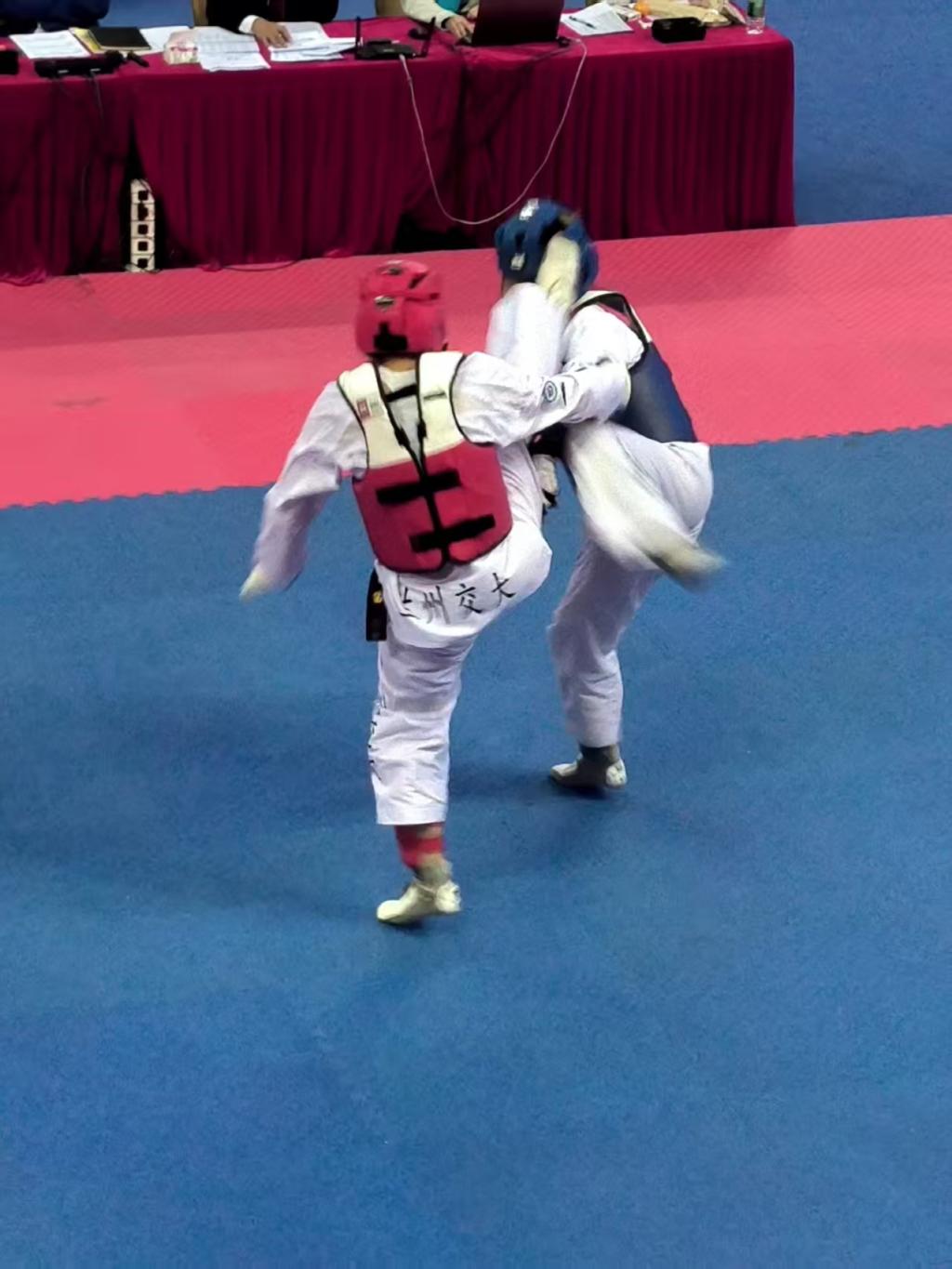 兰州交通大学代表队五名运动员凭借过硬实力与顽强斗志奋勇争先,最终斩获3金1银1铜、甲组女子团体冠军及体育道德风尚奖的亮眼战绩!其中,我院田径队队员,工管2301班贾苗同学表现尤为突出,在甲组女子70kg级比赛中,她敢打敢拼、沉着应战,以精湛的跆拳道技艺和坚韧不拔的毅力,一路过关斩将、力克强敌,成功摘得该级别冠军,为学院争光、为学校添彩!