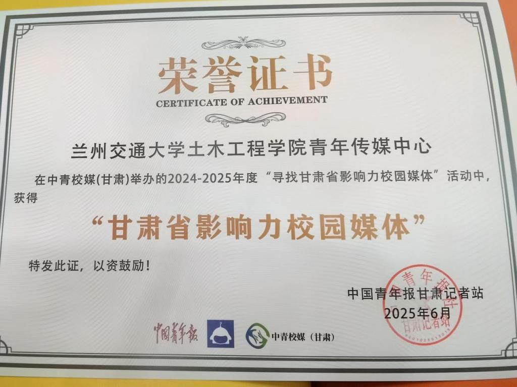 2025年6月7日,中青校媒(甘肃)2025年会暨第十五届主席团换届大会在西北师范大学团小铎思政剧场召开。会上对2024-2025年甘肃省年度影响力校园媒体进行了表彰。甘肃省近20家校媒参与了评选,经过优质内容、校园影响力、品牌活动、网络投票和会员媒体积分等指标的综合评比,兰州交通大学土木工程学院青年传媒中心荣获“甘肃省2024-2025年度十佳校媒”荣誉。