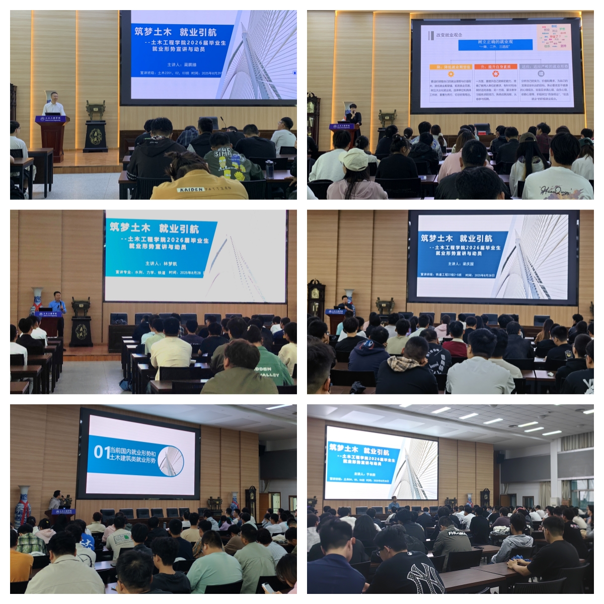 为深入贯彻落实党中央、国务院关于高校毕业生就业工作的决策部署,加强毕业生就业观念教育引导,全力推进“三抓三促”行动,抢抓“金九银十”就业工作关键期,促进学院2026届毕业生高质量充分就业,8月28日至29日,土木工程学院在三号实验楼五楼多功能举办六场次“筑梦土木,就业引航”2026届毕业生就业形势宣讲与动员系列宣讲会。学院全体班子成员在用人单位进校招聘前,深入联系各毕业班级,开展就业形式宣讲与动员,实施精准帮扶,引导2026届毕业生树立科学务实的就业观,提升学生的就业能力和就业竞争力。学院毕业生辅导员、23个本科毕业班全体同学参加了会议。