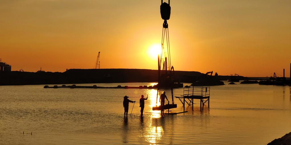 年初的斯里兰卡,气温逐渐攀升,烈日仿佛要沸腾了整个印度洋。在科伦坡港口城工程运河北口,正对着印度洋的夕阳,天地如熔炉一般。刚来到项目部的中国港湾年轻干部,深入一线,在运河中指挥吊装护岸方块。科伦坡港口城水工标就快完工,这165种共计7024块方块是中国港湾为港口城、为科伦坡、为南亚经济腾飞筑造的坚实基础。此刻夕阳正好透过280吨履带吊的吊索,这三两人不仅仅是港口城269公顷下的一个缩影,也是中国建设者给世界提出的成功的中国方案。