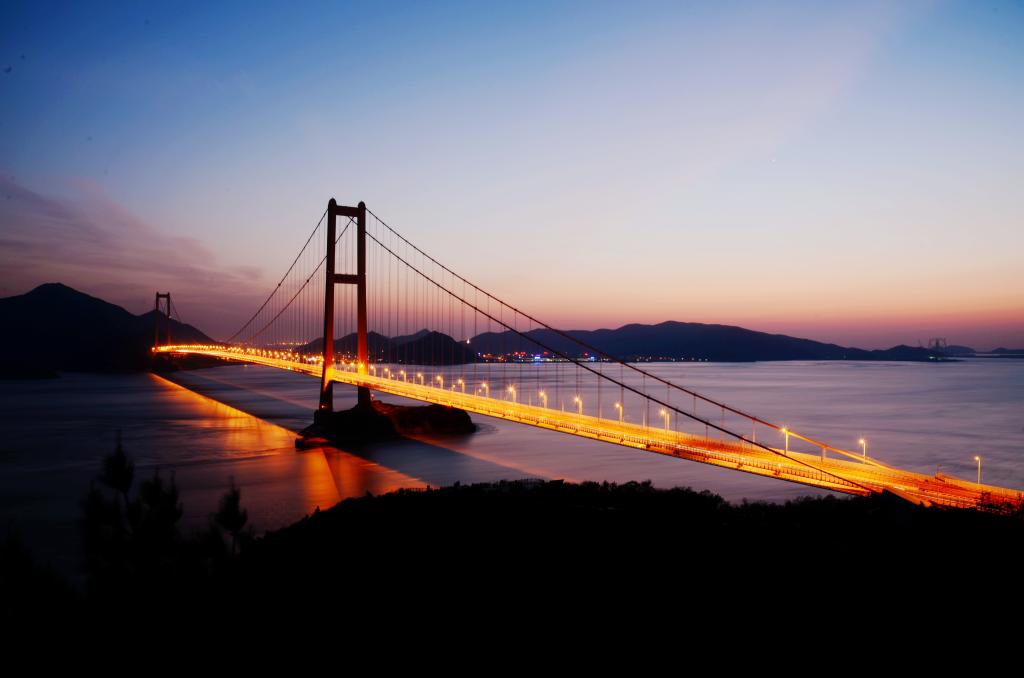 2007年12月16日上午11时18分,舟山连岛工程西堠门大桥全部126段钢箱梁完成吊装、连接,至此,世界最长的钢箱梁悬索桥——西堠门大桥主桥宣告全线贯通。西堠门大桥是舟山跨海大桥桥群中5座跨海桥中的一座悬索桥,连接金塘岛和册子岛,是五座跨海大桥中技术要求最高的特大型跨海桥梁,主桥为两跨连续钢箱梁悬索桥,主跨1650米,是目前世界上最大跨度的钢箱梁悬索桥,全长在悬索桥中居世界第二、国内第一,但钢箱梁悬索长度为世界第一。设计通航等级3万吨、使用年限100年。在晚霞余晖中和桥上灯火的映衬下,大桥显得更加雄伟壮观,雄姿勃发。