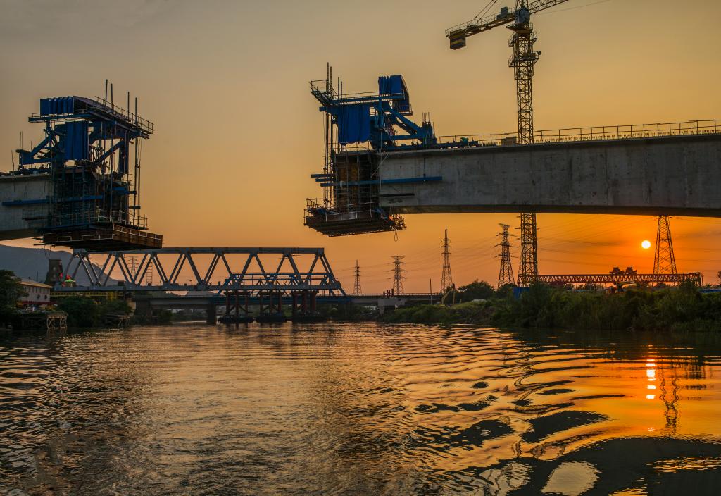 钢桁梁桥在跨越河流、公路等领域应用广泛。本项目桥梁涉及航道为长湖申线航道和梅湖线航道,均采用96m钢桁梁1跨过河。钢桁梁主桁类型为无竖杆整体节点平行弦三角桁架下承式有砟桥面简支钢桁梁。上下弦杆截面均采用焊接箱型断面,腹杆截面主要形式为箱型,部分杆件为工型截面。由于两处河流均为本地区重要的通航河道,水运船只密度较大,如果采用满堂膺架法,在水中搭设大量支架及钢平台进行拼装,可以保证钢桁梁安装精度,但施工周期长,封航时间长,对航道影响过大,可行性不高。而只要水深满足浮拖的条件,具备水上承托钢梁的设备和浮拖架梁的技术水平,本工程便采用浮拖法。本照片刚好拍摄在夕阳下,旁边桥梁合拢的时刻。