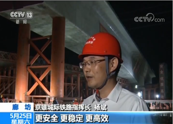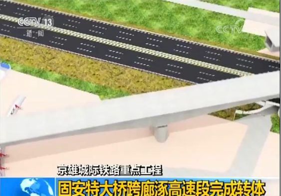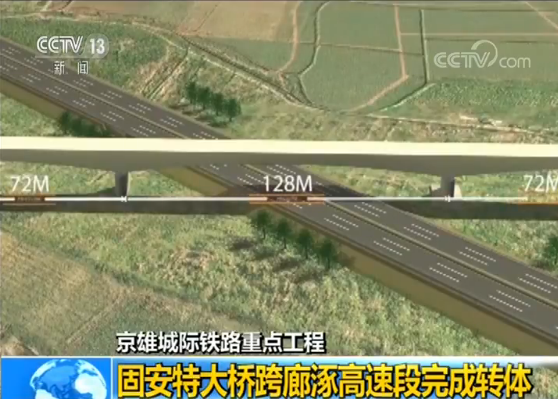 5月25日凌晨五点,正在建设的京雄城际铁路重点工程——固安特大桥,跨廊涿高速公路段,长128米的连续梁完成转体,中央电视台新闻频道对该项目工程进行了报道。