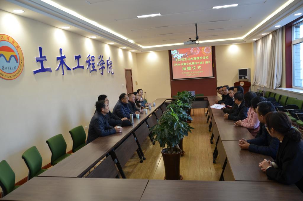 2018年11月23日,兰州交通大学土木工程学院工81校友,天水市建筑设计院马步真院长著作图书——《天水·伏羲文化肇始之源》捐赠仪式在土木学院会议厅隆重举行。学院党委书记李爱春,副院长韩峰,副院长/土木学院国家级实验教学示范中心常务副主任梁庆国,及相关老师共同出席了会议,捐赠仪式由李爱春书记主持。