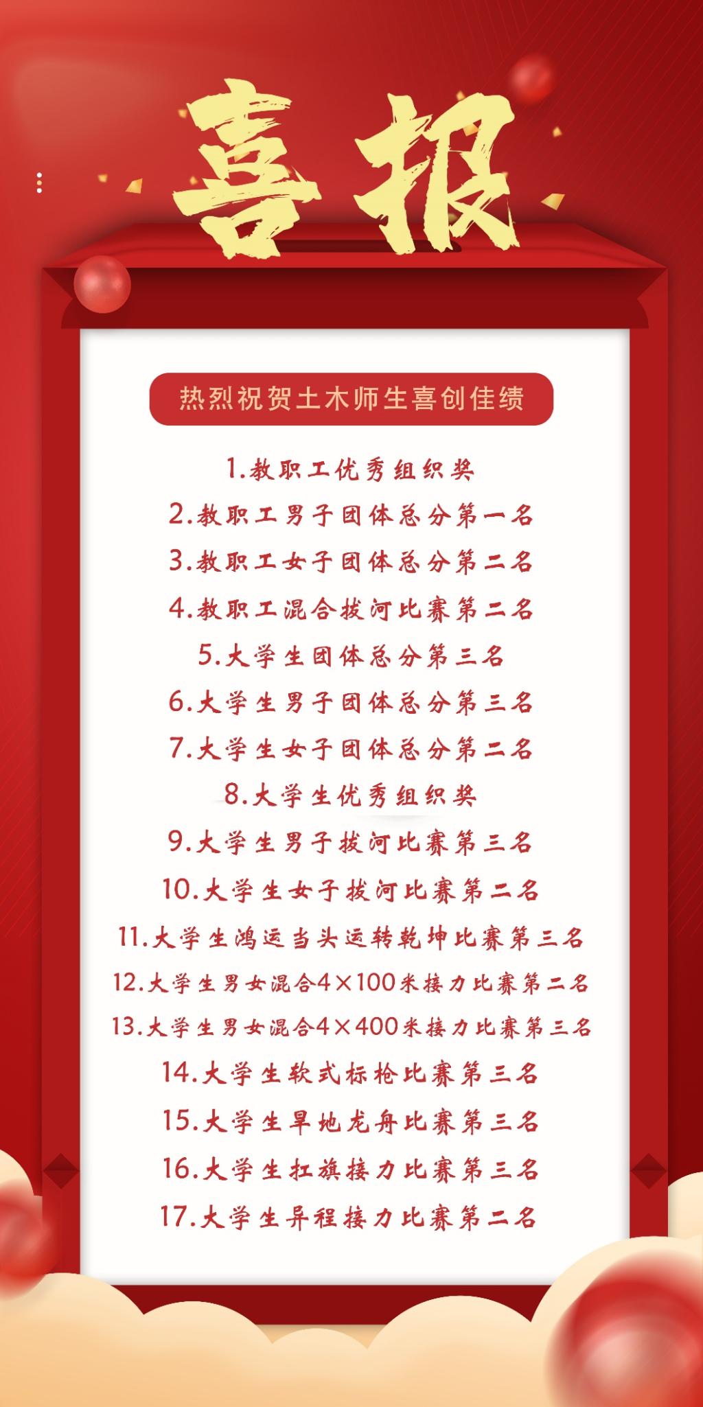 本届运动会土木学院收获17块奖牌,囊括了学校运动会全体项目奖牌,奖牌数历史最全、全校最多,成绩稳中有升,各项得分均创历史新高!
