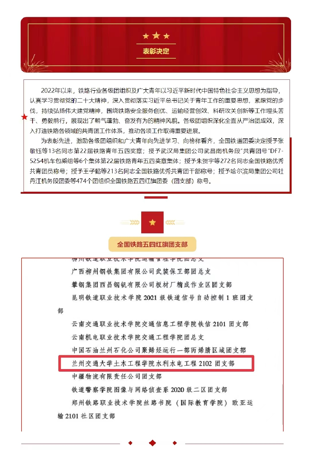 近日,全国铁路行业“两红两优”表彰名单出炉,对2022年以来全国铁路共青团系统表现突出的集体和个人进行表彰,我院水利水电工程2102团支部被授予“全国铁路五四红旗团支部”称号。
