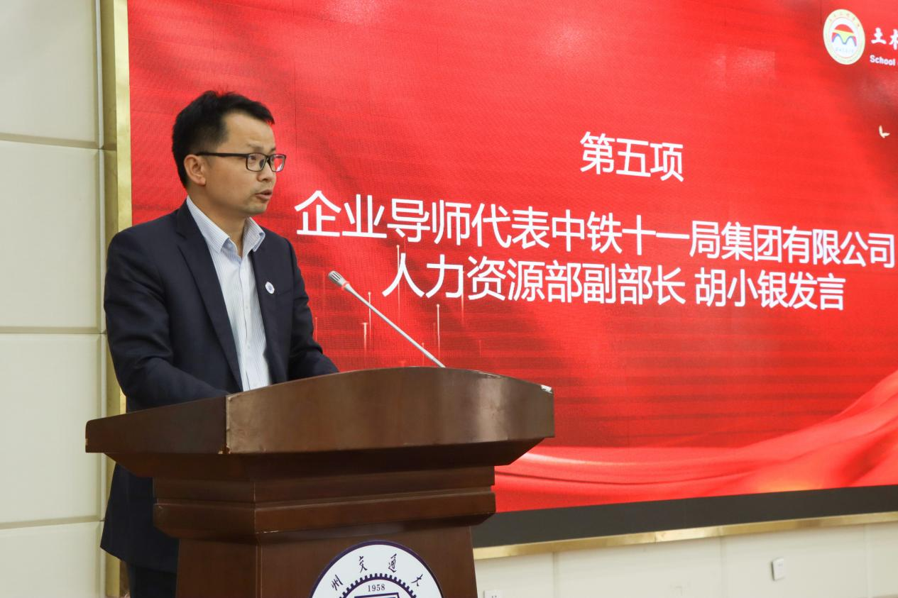 中铁十一局集团有限公司人力资源部副部长胡小银代表企业导师发言,他表示受聘企业导师是学校对企业人才培养工作肯定,聘书代表着沉甸甸的责任,是为了能够站在社会和企业角度去辅导学生、培养学生,让学生能够提前接触社会,了解行业背景,为学生就业提供最有效的指导和帮助。各位导师一定会按照职责要求,分享成长经历、交流求职技巧、做好就业指导和个人职业发展规划,充分发挥企业社会资源优势,帮助学生在校园期间了解行业情况以及行业企业文化,深化校企合作交流,带领同学们走进国家重点工程现场,让同学们切身感受基建狂魔的硬核实力。