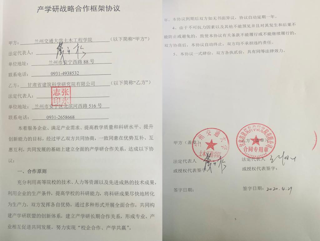 近日,我院与甘肃省建筑科学研究院有限公司签署了产学研战略合作框架协议。该协议的签订以服务企业、满足产业需求、提高教学质量和科研水平、提升创新能力为目标。