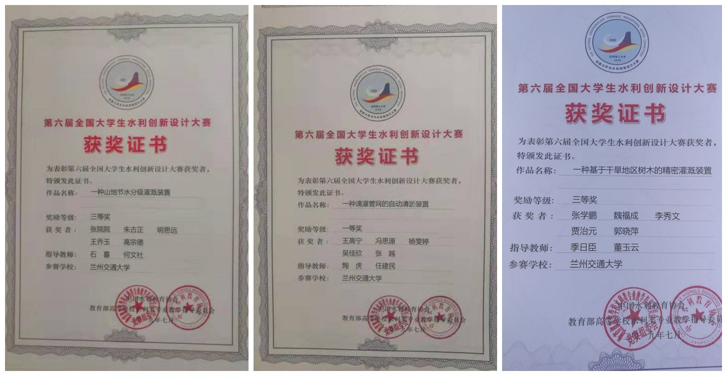 由陶虎副教授、任建民副教授指导,王高宁、冯思源、杨雯婷、吴佳欣、张越同学设计的作品《一种滴灌管网自动清淤装置》荣获大赛一等奖,由何文社教授、石喜副教授指导,张院院、王乔玉、高宗德、朱古正、明思远同学设计的作品《一种山地节水分级灌溉》荣获大赛三等奖,由季日臣教授和董玉云副教授指导,魏福成、张学鹏、贾志元、李秀文、郭晓萍同学设计的作品《一种基于干旱地区树木的精密灌溉装置》荣获大赛三等奖。