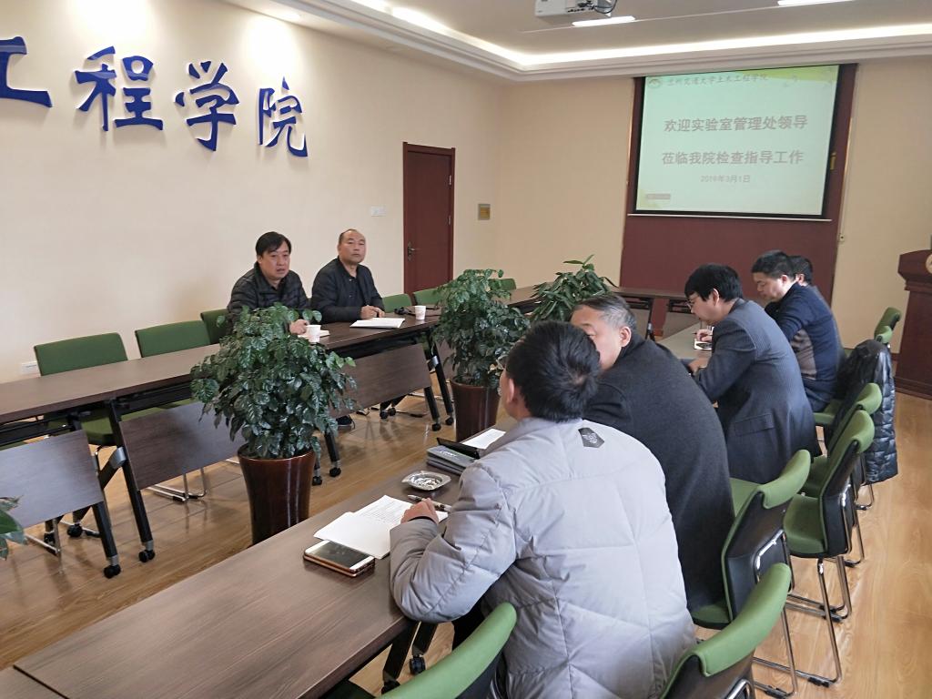 2019年3月1日,实验室管理处吴卫副处长、实验室管理处规划科汪诤科长到土木工程学院进行实验室建设工作调研。土木工程学院虞庐松院长、王旭副院长、韩峰副院长、梁庆国副院长和实验室办公室主任李子奇、张延杰等参加。