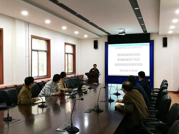 结合十八大会议精神及学校学院关于学校学院关于开展“两学一做”学习教育的重要精神,梁庆国教授做了《结合自身岗位实际争做优秀共产党员建设优秀实验教学团队》的专题报告,通过专题党课学习、研讨交流学、切实把“两学”教育落到实处;把“两学一做”与建设切实转变工作作风结合起来,与学生的教育教学结合起来,与加强教风建设结合起来,与建设优秀实验教学团队结合起来,以实际行动争做优秀共产党员。最后每位党员就结合自身岗位如何争做优秀共产党员建设优秀实验教学团队这一专题进行了交流讨论。
