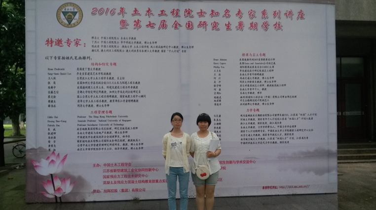 2016年7月1日—7日,2016年土木工程国际知名专家系列讲座暨第七届全国研究生暑期学校在东南大学举行。我院研究生常丽燕、王瑞璞作为正式学员分别参加了工程管理专题以及桥梁与岩土专题的学习并顺利毕业。